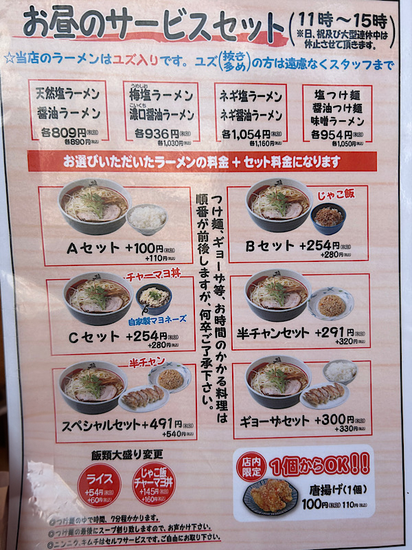 ラーメンは「天然塩」「醤油」「味噌」のほか、つけ麺や梅塩ラーメンも。